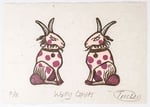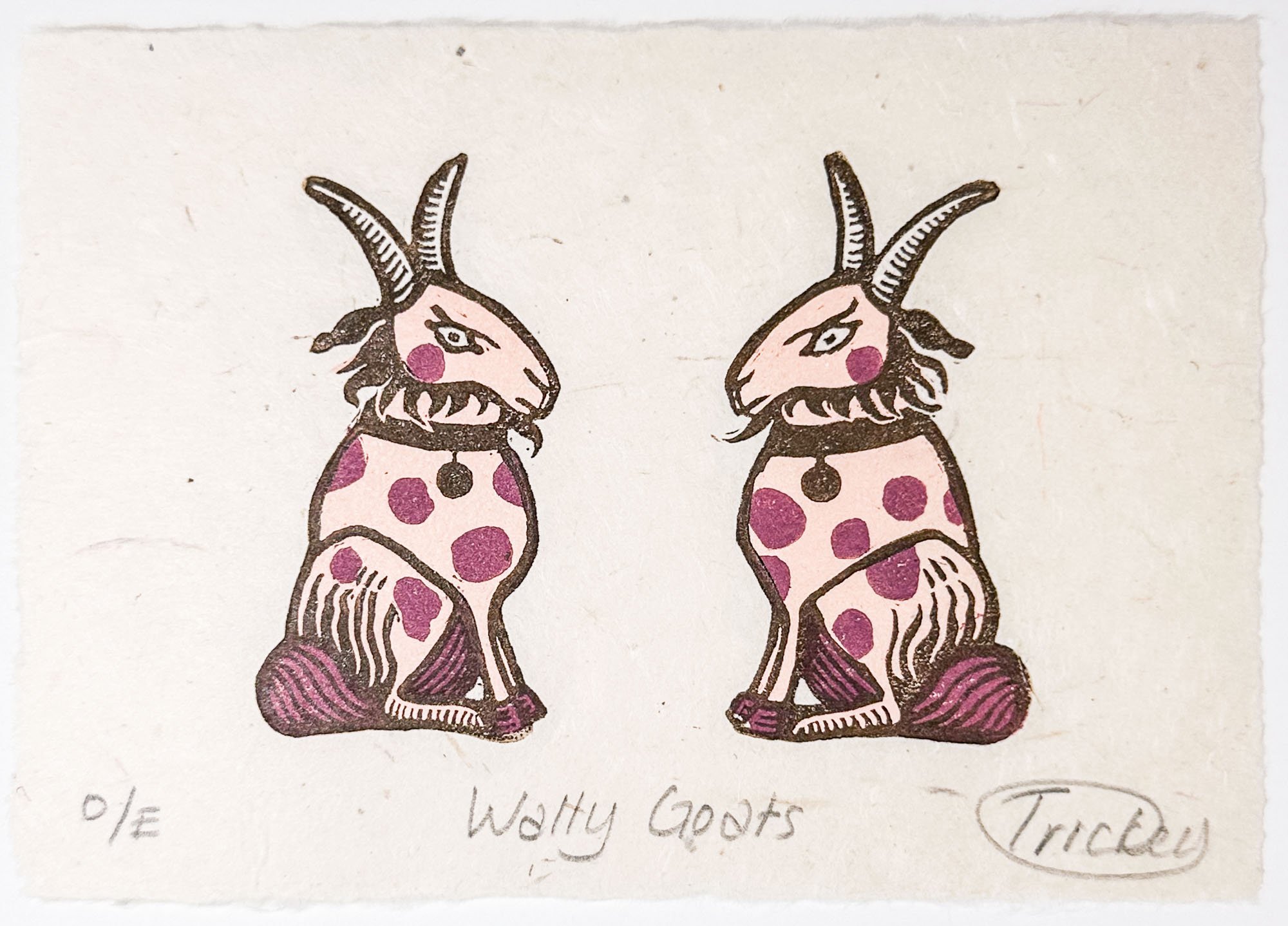 Open edition two colour lino print in either pink/purple or pink/blue ink on 100 gsm nepalese handmade paper and measuring roughly 15 x 10.5cm or A6.